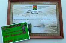 Наша Каратунская средняя общеобразовательная школа награждена Дипломом "За высокое качество образования по итогам 2023-2024 учебного года" и сертификатом на 15 тысяч рублей.