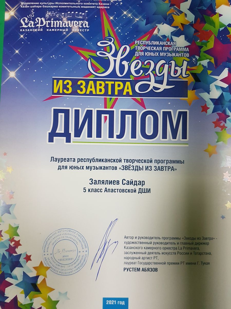 15 апреля состоялся гала-концерт зонального тура Республиканской творческой программы и профессиональной поддержки талантливых детей и подростков в области академической музыки «Звезды из завтра». От нашей школы в номинации вокал-соло выступили Гараева Чулпан, Мваку Амира, в номинациии инстурментальный-соло выступили Ахметзянова Ильзира (фортепиано), Залялиев Сайдар (баян). Все конкурсанты удостоились звания "Лауреат".