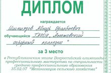 19 апреля 2018 года в п.г.т. Аксубаево на базе ГБПОУ "Аксубаевский техникум универсальных технологий" проводился Республиканский этап Всероссийской олимпиады профессионального мастерства по специальности "Механизация сельского хозяйства". Наш студент 151 группы Ешниязов Айнур Оралбаевич награжден дипломом за 3 место, а также были награждены дипломами преподаватели колледжа Абдулвалиев М.Г. и Вафин А.А. за подготовку обучающегося.