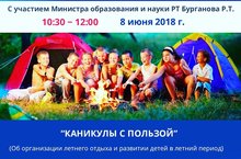 Республиканское интернет-собрание с участием Министра образования и науки РТ Бурганова Р.Т. Начало в 10:30 8 июня 2018г. Тема: "Каникулы с пользой" (Об организации летнего отдыха и развитии детей в летней период). Онлайн-трансляция на сайте: киу.рф