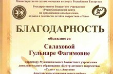 Министерство по делам молодежи и спорту РТ, ГБУ «Республиканский центр по организации оздоровления, отдыха и занятости детей и подростков «Лето» наградило директора МБУ ДО «ЦДТ» «Сэлэт» Салахову Гульнару Фагимовну благодарственным письмом. -