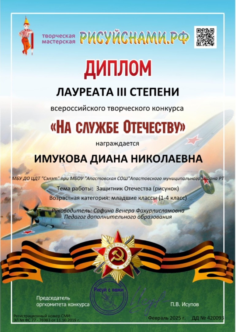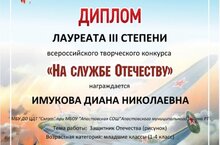 Обучающаяся объединения «Юный библиотекарь» (педагог Сафина В.Ф.) Имукова Диана, приняла участие во всероссийском творческом конкурсе "На службе ОТЕЧЕСТВУ". Конкурс посвящен тем, кто своим трудом, талантом и отвагой вносит вклад в процветание и безопасность нашей страны, кто гордится своей Родиной и готов рассказать о людях, чья жизнь – пример служения Отечеству.
