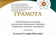 Согласно Плану мероприятий ГБУ ДО "Республиканский центр внешкольной работы" провел конкурс методических материалов и программ "Творчество, искусство, мастерство. МБУ ДО ЦДТ "Сэлэт" Апастовского муниципального района РТ достойно представил педагог дополнительного образования Саляхова Г.Ю.