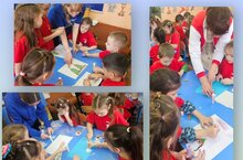 Бүген икенче кечкенәләр төркеме балалары белән кисеп ябыштыру шөгылендә Кар бабай ясадык.