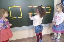 Сегодня дети на занятии по математике " Интересные фигуры", познакомились еще с одной геометрической фигурой: "прямоугольник".Ребята, выкладывая из коротких и длинных полосок геометрические фигуры: квадрат и прямоугольник, учились находить сходства и различия предметов по форме.