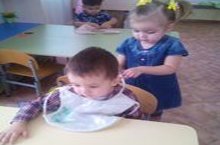 Дети ясельной группы помогают завязывать нагруднички друг другу.