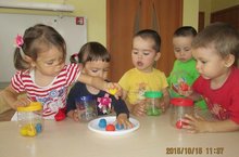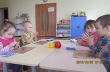 Дети, играя с цветными шариками, закрепляют представления о четырёх цветах, учат выделять цвета, развивают мелкую моторику пальцев.