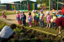 Дети наблюдают за тем, как воспитатели сажают деревья. -