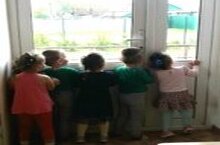 Наблюдение за дождём через окно в ясельной группе. / Иң кечкенәләр төркеменә йөрүче балалар тәрәзә аша яңгыр явуын күзәтәләр.