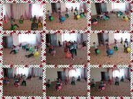 Дети на утренней гимнастике делали упражнения на фитболах под музыкальное сопровождение. / Балалар иртәнге гимнастика вакытында музыка астында фитболлар белән күнегүләр ясадылар.