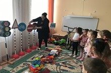 Сегодня в нашем детском саду прошло мероприятие по ПДД "Потерянные знаки". У нас в гостях был старший инспектор ОГИБДД ОМВД России по Апастовскому району, Гафуров Р.Р. Так же к детям в гости приходили сказочные герои: инспектор, почтальон Печкин, Буратино и Баба Яга. Дети пели песни, танцевали, отгадывали загадки, читали стихи о дорожных знаках. /Бүген безнең балалар бакчасында "Югалган юл йөрү кагыйдәләре" исемле мероприятие булды. Кунакка өлкән инспектор ОГИБДД ОМВД России Апас районы буенча Гафуров Р.Р. килде. Балалар җырладылар, биеделәр, юл йөрү кагыйдәләре турында табышмакларга җаваплар эзләделәр.