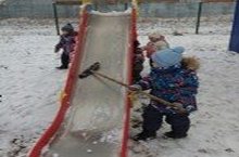 Труд. Дети второй младшей группы помогают убирать снег с построек на участке. / Хезмәт. Икенче кечкенә төркеме балалары, бакча тирәсендәге ясалган сыннарны яуган кардан чистарталар.