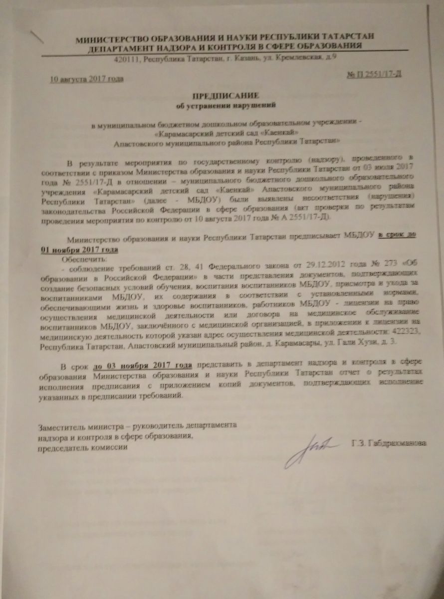 Предписание Департамента об устранений нарушений № 2551/17-Д от10.08.17года