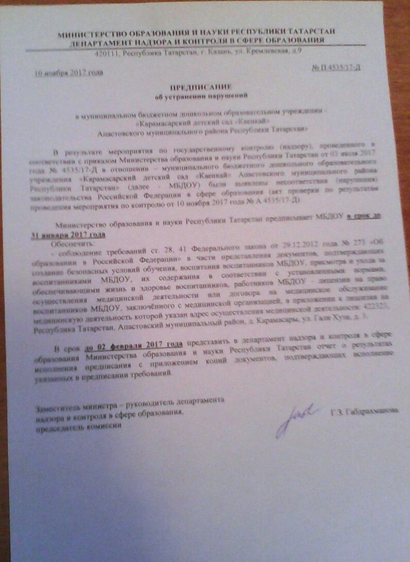 Предписание Департамента об устранений нарушений от 10 ноября 2017г. №П 4535/17-Д