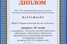 В мониторинге "За высокое качество дошкольного образования" среди базовых дошкольных образовательных организаций Апастовского муниципального района по итогам 2023-2024 учебного года МБДОУ "Каратунский детский сад" Гульчечек" занял 3 место. Поздравляем