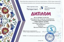 Мәктәпкә хәзерлек төркеменнән Сәйфетдинова Зөлфия "Мин яратам сине, Татарстан!" ачык республикакүләм бәйгесендә катнашып III дәрәҗә лауреат исеменә лаек булды. Котлыйбыз! (җит. тәрбияче Миннуллина Л.А.)