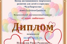 Наши воспитанники детского сада участвуют в разных конкурсах. И в очередной раз воспитанник старшей группы Исмагилов Риназ Радикович участвовал во всероссийском дистанционном конкурсе "Самые любимые" и занял 1 место. Поздравляем!