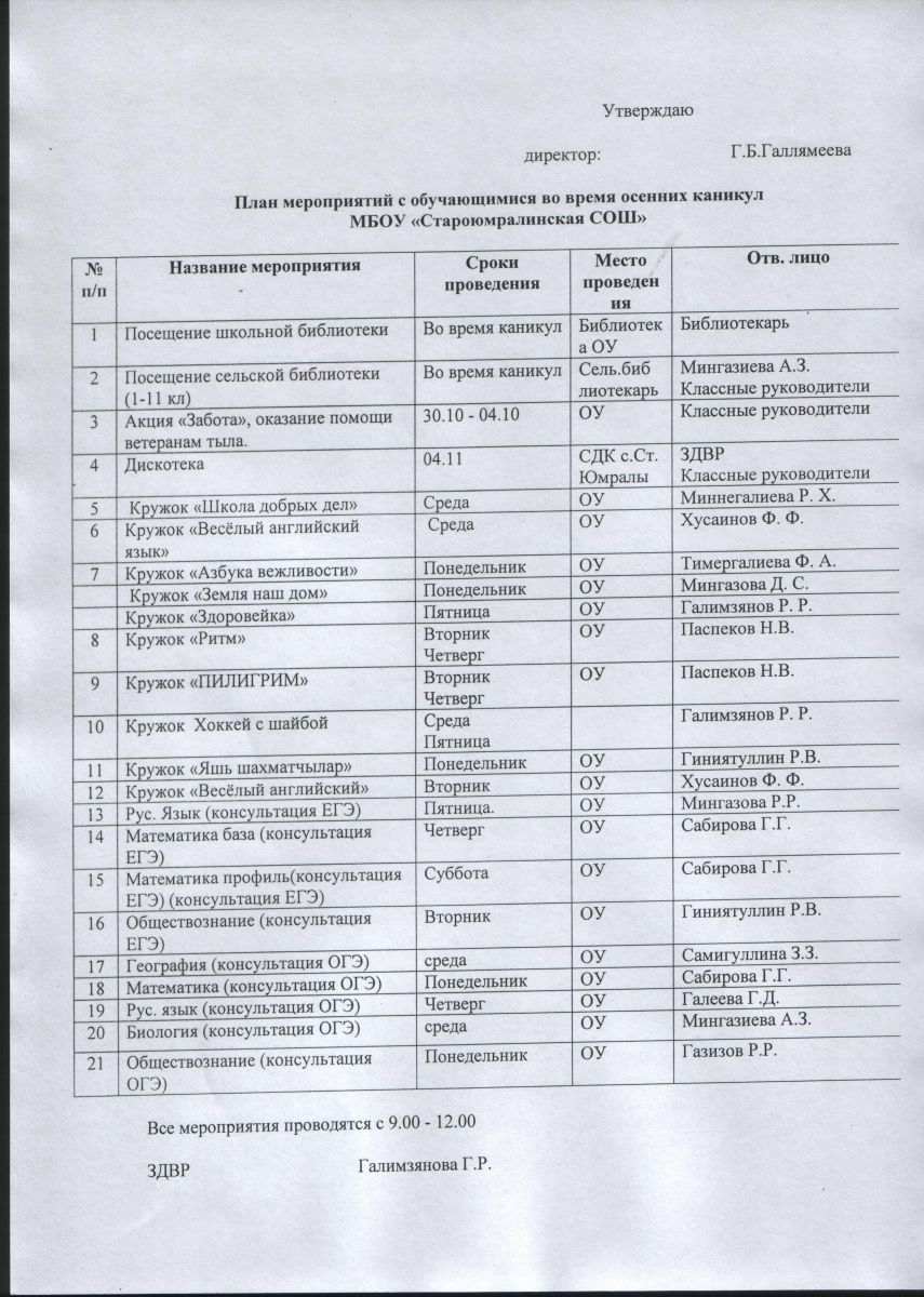 План мероприятий с обучающимися во время осенних каникул (2017-2018 уч.г.)
