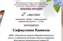 В республиканском конкурсе творческих работ среди воспитанников, учащихся и педагогических работников образовательной организации «Весенний перезвон» ученица 4-б класса Сафиуллина Камилла Айдаровна в номинации «Мама – самая родная» заняла 2 место