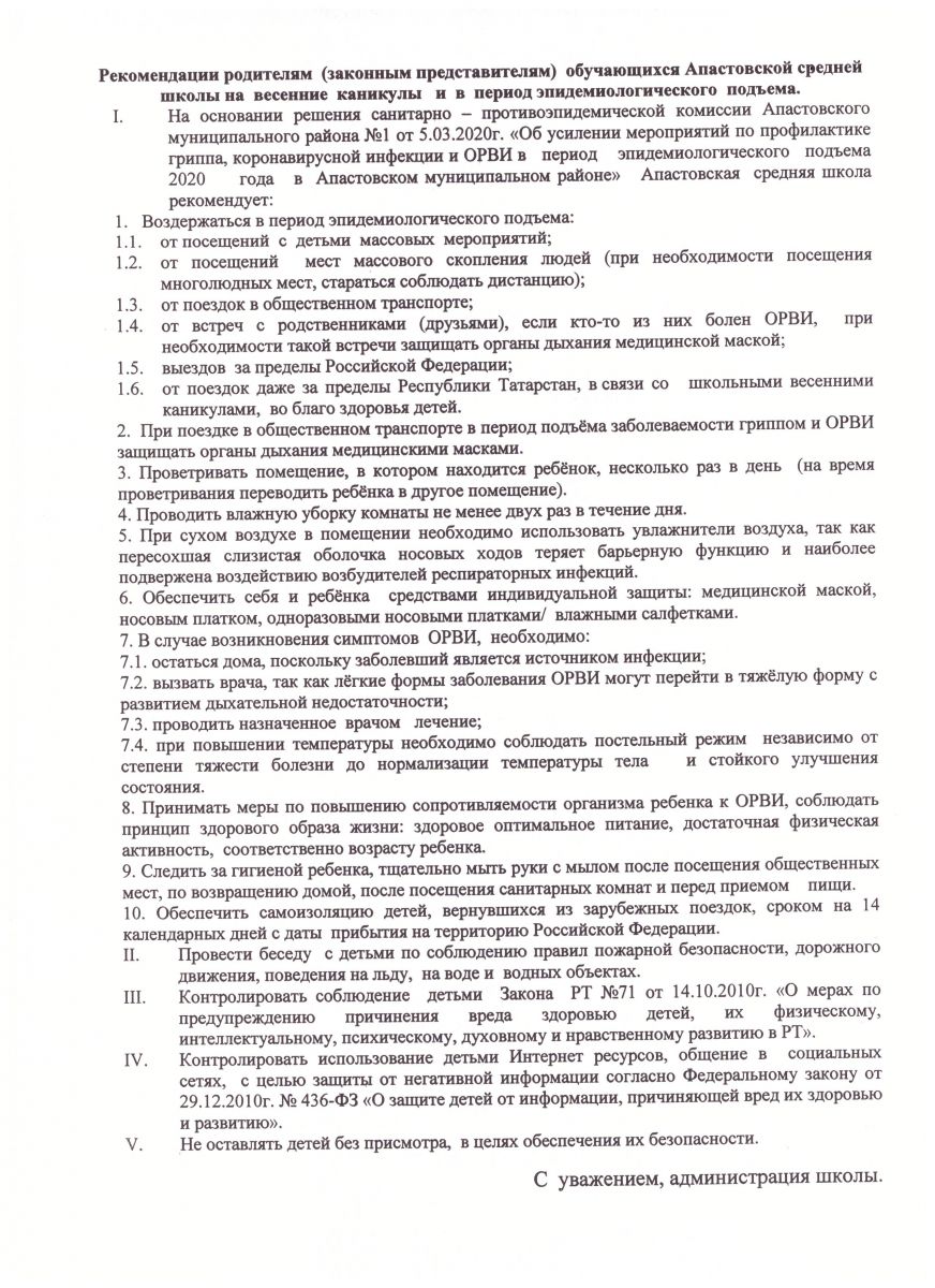 Рекомендации родителям (законным представителям) обучающихся Апастовской средней школы на весенние каникулы и в период эпидемиологического подъема (скачать)
