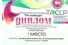 Обучающаяся 2в класса Харитонова С. (рук. Гумерова Р.Г.) участвовала в республиканском конкурсе творческих работ среди воспитанников и обучающихся образовательных организаций «Татарстану - 100» и была удостоена дипломами 1 степени в номинации литературное творчество «Летопись родного края» и в номинации фотоколлаж «Край, в котором ты живешь».