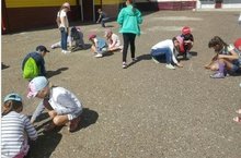 17 - й день лагеря" Солнышко". Сегодня ребята рисовали на асфальте "Пусть всегда будет солнце". Затем посмотрели очень интересный фильм о планетах. После обеда провели репетицию.