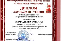 Ученица 9 класса Мефодьева Э., рук.Сафиуллина Э.Д., приняла участие в XII Межрегиональном конкурсе чтецов «Туган телем-серле тел» и получила диплом III степени.