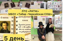 «Народное достояние России. На книжно-иллюстративной выставке, подготовила библиотекарь школы. «В тридевятом царстве в Пушкинском государстве» дети познакомились с биографией Пушкина, изложенной в сказочном стиле. Среди огромного количества книг, каждый из ребят нашел для себя самые интересные и захватывающие литературные шедевры любимого поэта. Яркие иллюстрации наглядно представляли красочные сюжеты произведений. Дети вспоминали названия сказок, окончания из предложенных отрывков произведений и с удовольствием отвечали на каверзные вопросы. Завершилась литературная викторина высказыванием А.С Пушкина, которое собрали дети: «Что за прелесть эти сказки! Каждая есть поэма!». Не менее важным мероприятием дня, было проведение воспитателями и вожатыми игры по станциям «Там на неведомых дорожках». Вот и прошел пятый день в пришкольном летнем лагере «Сказка».