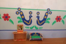 Милли почмак . Бакчада милли тэрбия буенча эш алып барыла. Балаларга аерым милли почмак булдырылды. Анда матур татар бизэклэре белэн чигелгэн солгелэр,карават япкычлары,остэл эскэтерлэре,идэн паласлары,чигуле мендэрлэр урын алган. Борынгы савыт- саба белэн бизэлгэн остэл янында матур татар кызы утыра. Анын остендэ бала итэкле кулмэк,камзул,башында энже белэн чигелгэн калфак.