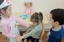 "Табиб уенын уйнау" 19.11.2021 Балаларның хезмәт турында белемнәрен арттыру, хезмәт кешеләре-табиб,пешекче, сатучы, тәрбияче хезмәткәрләренең хезмәте белән таныштыру, хезмәтләренең кирәкле булуы турында сөйләү, хезмәт кешесенә хөрмәт тәрбияләү максатыннан чыгып зурлар төркеменә йөрүче балалар табиб уены уйнадылар. Үзләре табиб булып укол кадап, температураларын үлчәделәр. Бу уенны балалар бик яратып уйныйлар.