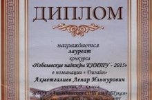 Казан милли тикшеренү технология университеты тарафыннан үткәрелгән “Нобелевские надежды КНИТУ -2015” конкурсында безнең мәктәптән Әхмәтгалиев Ленар , Гатауллина Фаягөл ,Мөхәммәтдинова Чулпан катнашты һәм Дипломнар белән бүләкләнделәр.