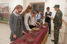 В рамках месячника «Года наших великих побед» была проведена встреча с участниками поискового отряда. «Прометей». Руководитель отряда, преподаватель АПК им Г. Тукая Ильхам Низаметдинов рассказал о деятельности отряда, ознакомил с многолетней историей поисковых работ. Ребята с большим интересом смотрели экспозиции находок: каску советского солдата, гранату, штыки, ножи, мыльницу и другие предметы.