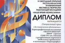21 октября в КСК КГУ УНИКС прошел IV Ежегодный открытый республиканский телевизионный фестиваль творчества работающей молодежи "Наше время- Безнең заман". В конкурсе приняли участие 29 коллективов. Хореографический коллектив молодых учителей нашей школы выиграл в номинации "За творческое вдохновение" и был награжден специальным призом.