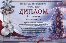 Наша школа награждена Дипломом I степени за лучшее новогоднее оформление образовательных учреждений в конкурсе "Новогодние узоры" и Дипломом за самое музыкальное выступление в новогоднем творческом конкурсе "В гостях у Кыш Бабая", памятными подарками.