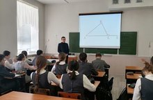 В рамках недели математики и информатики, 17 февраля, в 7В был проведен открытый урок по геометрии «Внешний угол треугольника». В ходе урока учащиеся познакомились с понятием внешнего угла треугольника, с формулировкой определения, рассмотрели свойство внешнего угла треугольника, закрепили знания о сумме углов треугольника и о внешнем угле треугольника при решении задач.