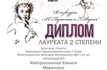 Ещё одна большая победа наших детей. Файзрахманова Камиля участвовала в Республиканском творческом конкурсе "В созвездии А.С Пушкина и Г.Тукая" , и получила диплом лауреата 2 степени. Поздравляем её и желаем в дальнейшем ещё больших достижений. Молодец, умница!!!!!