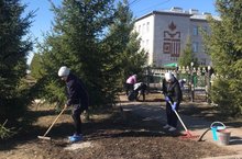 Вооружившись граблями и лопатами, мы вышли на территорию, и работа «закипела». Был убран мусор и сухая листва на всей территории, расчищены клумбы, выкрашены стволы деревьев. А тёплая, солнечная погода только располагала к плодотворному труду. -