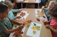 На занятиях в детском саду дети выполняют самые простые работы — создают силуэты знакомых животных и птиц, делают элементарные цветочки. Собрали листочки во время прогулки. Основная задача формировать начальных навыков работы с ножницами, клеем, бумагой.
