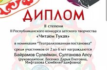 Поздравляем воспитанников средней группы Байрамова С., Султанову А. с победой во II Республиканском конкурсе детского творчества "Читаем Тукая" в номинации "Театрализованная постановка"! Гордимся вами!