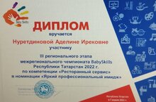 7 апреля прошёл III региональный этап Межрегионального Чемпионата BabySkills-2022 по Республике Татарстан. Из нашего детского сада на данном чемпионате участвовала воспитанница подготовительной группы Нуретдинова Аделина по компетенции «Ресторанный сервис» награждена дипломом в номинации «Яркий профессиональный имидж»