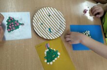 В средней группе сегодня художественное творчество (лепка), тема которой: "Лепка березы ёлочки". Цель: учить детей описывать и сравнивать деревья. Задачи: образовательные: - учить находить характерные особенности внешнего строения разных видов деревьев; - упражнять в употреблении существительных множественного числа; - учить передавать в лепке толщину и расположения веток ёлочки и берёзы. Уртанчылар төркемендә әвәләп ябыштыру шөгыле. Тема:" Каен белән чыршы ясау", Максат: Балаларга чыршы белән каенны ничек аерырга кирәклеген аңлату. Бурычлар: - агачларны тышкы күренешләре бн үсешләрен чагыштыру, - әвәләп ясаган вакытта балаларга ике төрле агачның ботакларын нинди алымнар белән тулыландырырга кирәклеген күрсәтү.