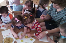 Применение нетрадиционного материала для придания более яркой выразительности детских поделок. 11.04.2016 Мы – взрослые, знаем, что для маленького ребёнка процесс лепки приносит огромное удовольствие и то, что он может этим видом изобразительной деятельности заниматься продолжительное время. А для того, чтобы маленькой фигурке придать образность и получить целый творческий сюжет необходимо вызвать интерес к продолжению работы. Вот и наши педагоги, работающие с самыми маленькими воспитанниками, учат их творческому преобразованию своей поделки. Полюбуйтесь, с каким удовольствием дети украшают солнышко необычными лучиками, а ёжик приобрёл загадочные иголки из крупы гречихи. Такое увлечение приносит детям помимо удовольствия и неоценимую пользу для здоровья тела и души.