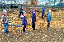 Дошколята любят трудиться, сгребая в кучи опавшую листву. Мы с ребятами организовали на участке уборку опавших листьев, засохших цветов на клумбе. Они с радостью принимались за дело, совместный труд объединил их. Ребята договаривались кто будет подметать опавшие листья, кто складывать их на носилки, кто будет относить листву к мусорному контейнеру.