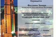 Поздравляем воспитанников нашего детского сада Ф. Замиру, З. Зульфата, Г. Камилю, ставших победителями районного молодежного фестиваля эстрадного искусства в номинациях "Вокал - соло 1 младшая группа" и "Конферанс младшая группа" (руководитель - Абдуллина Ю.И.). Желаем дальнейших успехов!