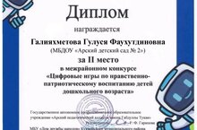 Поздравляем воспитателя нашего детского сада Галияхметову Г. Ф. за 2 место в межрайонном конкурсе "Цифровые игры по нравственно-патриотическому воспитанию детей дошкольного возраста" . Желаем дальнейших успехов!
