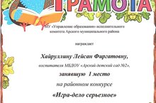 Подвелись итоги районного конкурса среди воспитателей ДОО Арского муниципального района "Игра-дело серьезное". От нашего детского сада участие приняла воспитатель Хайруллина Л. Ф. Она представила жюри ИКТ- игру, созданную на платформе learnings.apps.ru Работа удостоилась высоких оценок и заняла 1 место. Поздравляем!