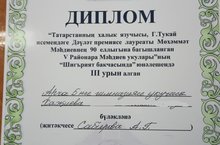 "Татарстаннын халык язучысы,Г.Тукай исемендэге Дэулэт премиясе лауреаты Мохэммэт Мэхдиевнен 90 еллыгына багышланган 5 нче Районара Мэхдиев укулары"нын "Шигьрият бакчасында"юнэлешендэ 3 нче урынны 6Б сыйныфы укучысы Хажиева А.А.алды.Укытучысы: Сабирова А.Г.