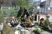 Ожившие картины войны представляли учащиеся школ г.Арска 9 мая. Наша картина называлась "На привале". Учащиеся гимназии показали, каково было солдатам на привале во время коротких передышек между боями. Кто-то перевязывал раны, кто-то писал домой письма-треугольники, а кто-то поднимал боевой дух солдат,заводя патефон или исполняя на гармошке задушевные песни. Там же стояла полевая кухня, где что-то варилось. У каждого солдата в то время была за голенищем сапога алюминиевая ложка. Но она выполняла роль не только столового прибора, но и была своего рода «визитной карточкой». Объяснение этому такое: существовало поверье, что если ты носишь в брючном кармане-пистоне солдатский медальон, то тебя обязательно убьют. Поэтому большинство бойцов все свои данные выцарапывали на ложке. И поэтому даже сейчас, когда поисковики находят останки солдат, погибших во время Великой Отечественной войны, их фамилии устанавливают именно по ложкам. На привале ребята раздавали боевые листки с приказом Верховного Главнокомандующего об окончании Великой Отечественной войны.