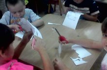 Бүгенге шөгыль вакытында кайчы белән эшләүне ныгыттык. Мәктәпкә әзерлек төркеме балалары икегә бөкләп кисәргә өйрәнделәр. Нәтиҗәдә бер кисүдә ике филебез булды.