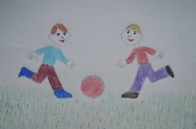 -Посмотрите на рисунок. Как вы думаете, во что играют дети? Как вы узнали? В какой позе находится тело сидящего человека? Как нарисовать у него ноги, руки? По каким признакам вы узнали, что мальчик бежит? Да, туловище немного наклонено вперёд, руки и ноги полусогнуты, одна нога впереди, другая сзади расположены.